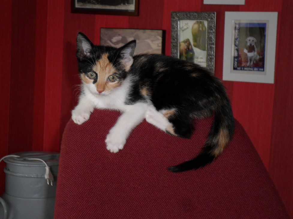 Ze is geboren bij de familie Top in Warnsveld. We wilden hun naam graag in haar naam. Topaz is een steen met meerdere kleuren, dus heel toepasselijk voor een lapjeskat. Ze wist meteen raad me de zee aan ruimte op de boerderij, het is een heel pittig diertje. Tot nu toe is hond Bjorn haar grote vriend en beschermer (zo goed en kwaad als hij dit kan) en Miss Lizzy is een boze stiefmoeder. Hopelijk draait ze nog wat bij. Topaz is vrolijk, onbezorgd en speelt en ontwikkelt er flink op los. Iedereen geniet enorm van haar aanblik!