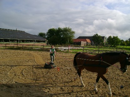Ook was hij een paar keer oefenobject bij cranio sacraal studenten, ging hij naar de chiropracter en kreeg hij zelfs een reconnetion healing sessie. Alles hielp en beetje bij beetje kon hij zijn wie hij was en kwam zijn geweldig fijne karakter naar voren. En ondanks al zijn wangedrag werd me al snel duidelijk: de mens trappen of bijten, dat zou hij nooit doen. Ook bij het behandelen van wondjes e.d. was hij voorbeeldig, evenals bij de smid. Er was 1 hardnekkig probleem dat bleef en dat was dat hij had geleerd dat hij sterker was aan de lijn, hij trok zich dan los, maar altijd rechtsom. Gelukkig werd ook dit probleem met de jaren minder en minder, wist ik het steeds beter te voorkomen en doofde het zo uit. Heel veel kinderen hebben plezier op hem gehad, die kon je er met een 200% gerust hart op zetten of eromheen laten zijn, hij was zo braaf en voorzichtig als je, je maar wensen kon! Ook hebben enkele lesklanten op hem gereden, hij was het voorspelbare, betrouwbare paard wat je, je wenste. Zekerder als ik in de buurt was, dat wel, maar dat was o.k. Ook voor de freestyle lessen was hij heel geschikt, temeer omdat hij zo specifiek was en "dag en nacht" verschilde met Touchy. Er waren kinderen die er "alles" mee konden en er waren volwassenen die hem, letterlijk, niet van de plek kregen. Echt! :) Dit paard had een 7de zintuig voor de intentie van de mens ontwikkeld. Grondwerk, schrik&obstakeltraining was zijn ding. Hij was het enige paard wat ik -